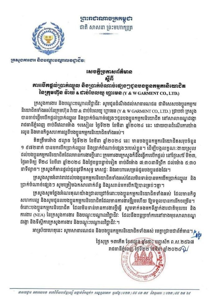 កម្មករនិយោជិត នៃក្រុមហ៊ុន Y&W ជិត២ពាន់នាក់បានបេីកប្រាក់អតីតភាពការងារ គិតត្រឹមម៉ោង៥ល្ងាចថ្ងៃទី២២ ខែមីនា ឆ្នាំ២០២៤ នេះបេីយោងតាមសេចក្តីប្រកាសព័ត៌មានរបស់ក្រសួងការងារ ស្តីពីការបើកផ្តល់ប្រាក់ឈ្នួល និងប្រាក់បំណាច់ផ្សេងៗ ជូនបងប្អូនកម្មករនិយោជិតនៃក្រុមហ៊ុន វ៉ាយ & ដាប់បែលយូ ហ្គាមេន (Y & W GARMENT CO., LTD.)
