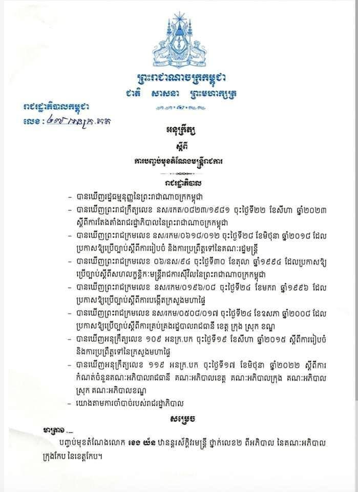 ថ្ងៃនេះខ្ញុំមានការចាំបាច់ត្រូវអនុវត្តអភិក្រមទី៥ គឺ “ការវះកាត់” តាមរយៈការចុះហត្ថលេខា ដើម្បីបញ្ចប់មុខតំណែងរបស់អភិបាលក្រុងកែប ដែលបានប្រើប្រាស់អំណាចនៃតួនាទីរបស់ខ្លួនប្រព្រឹត្តអំពើដែលនាំឲ្យប៉ះពាល់ដល់ផលប្រយោជន៍រដ្ឋ និងផលប្រយោជន៍របស់ប្រជាពលរដ្ឋជាច្រើន។ ការសម្រេចចិត្តនេះគឺផ្អែកទៅលើមូលដ្ឋានច្បាស់លាស់ នៃការស៊ើបអង្កេតរបស់អង្គភាពប្រឆាំងអំពើពុករលួយ។