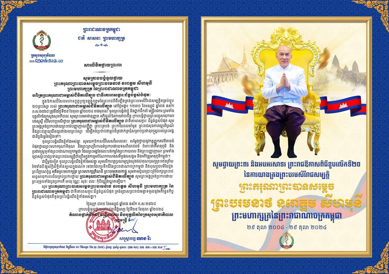 រដ្ឋមន្រ្តី-មន្រ្តីរាជការនៃក្រសួងសុខាភិបាល ទូលថ្វាយ ព្រះពរ ព្រះករុណាព្រះបាទសម្តេចព្រះបរមនាថ នរោត្តម សីហមុនី ព្រះមហាក្សត្រ នៃព្រះរាជាណាចក្រកម្ពុជា ក្នុងឱកាសដ៏សែនមហានក្ខត្តឫក្សឧត្តុង្គឧត្តមនៃព្រះរាជពិធីឡើងគ្រងព្រះបរមសិរីរាជសម្បត្តិគម្រប់ខួប ២០ព្រះវស្សា នៅថ្ងៃទី២៩ ខែតុលា ឆ្នាំ២០២៤