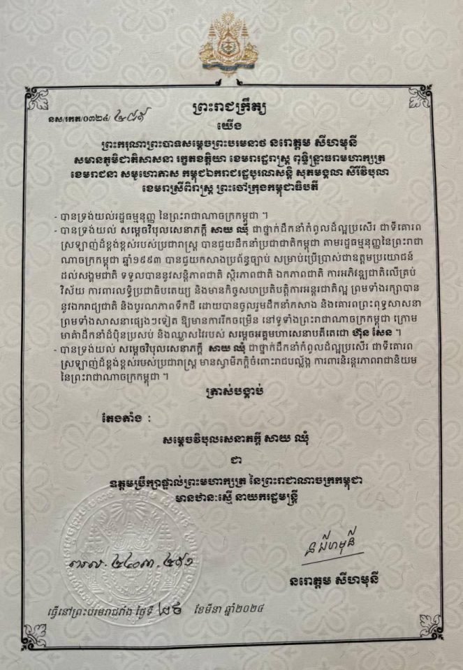 (ភ្នំពេញ)៖ ព្រះករុណា ព្រះបាទ សម្តេចព្រះបរមនាថ នរោត្តម សីហមុនី ព្រះមហាក្សត្រនៃព្រះរាជាណា ចក្រ កម្ពុជា បានចេញព្រះរាជក្រឹត្យត្រាស់បង្គាប់តែងតាំង សម្តេចវិបុលសេនាភក្តី សាយ ឈុំ ជាឧត្តមប្រឹក្សាផ្ទាល់ព្រះមហាក្សត្រនៃកម្ពុជា មានឋានៈស្មើនាយករដ្ឋមន្ត្រី។