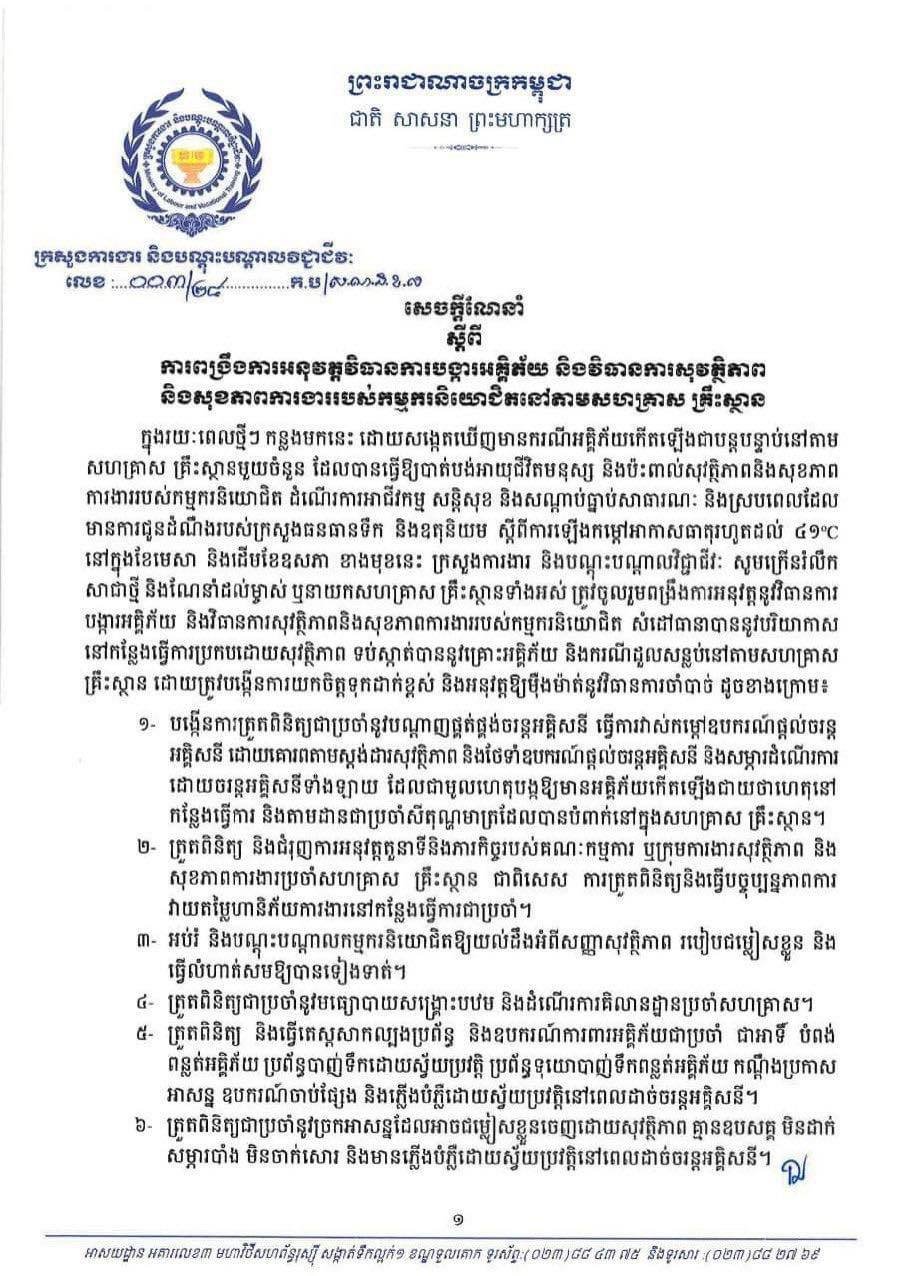 សេចក្តីណែនាំ ស្តីពីការពង្រឹងការអនុវត្តវិធានការបង្ការអគ្គិភ័យ និងវិធានការសុវត្ថិភាពនៅតាមសហគ្រាស គ្រឹះស្ថាន