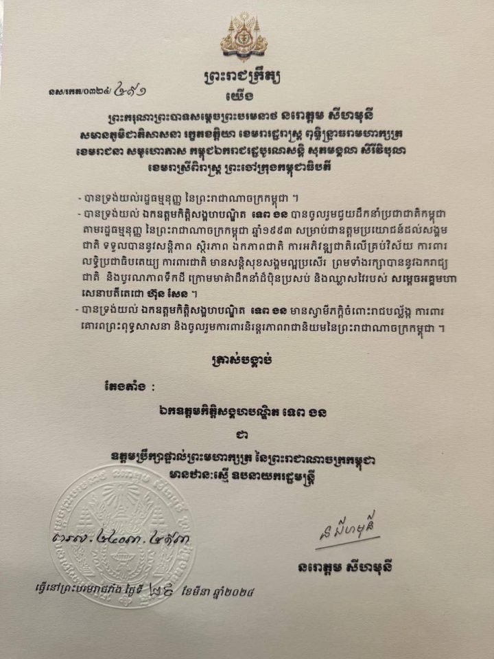ឯកឧត្តមកិត្តិសង្គហបណ្ឌិត ទេព ងន ត្រូវបានតែងតាំងជាឧត្តមប្រឹក្សាផ្ទាល់ព្រះមហាក្សត្រនៃកម្ពុជា មានឋានៈស្មើឧបនាយករដ្ឋមន្ត្រី