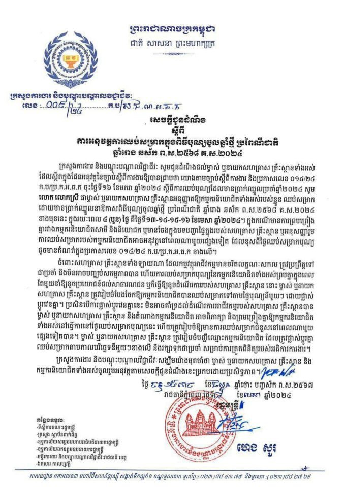 សង្ក្រាន្តឆ្នាំនេះ កម្មករនិយោជិតទូទាំងប្រទេស នឹងបានឈប់សម្រាករយះពេលដល់ ០៤ថ្ងៃក្នុងពិធី បុណ្យចូលឆ្នាំថ្មីប្រពៃណីជាតិ នាពេលខាងមុខ