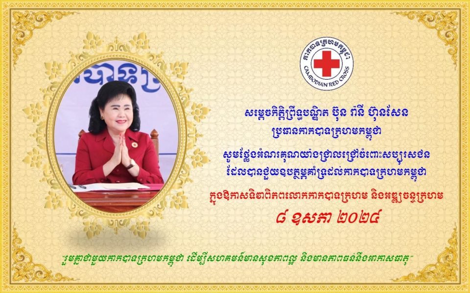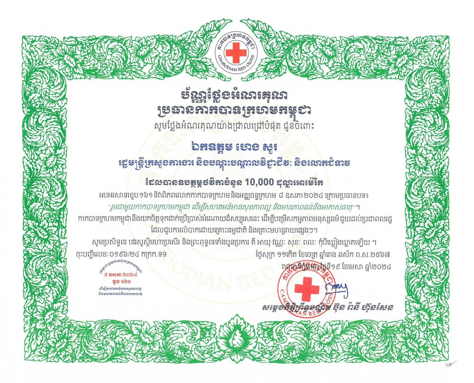 សម្តេចកិត្តិព្រឹទ្ធបណ្ឌិត ប៊ុន រ៉ានី ហ៊ុនសែន ប្រធានកាកបាទក្រហមកម្ពុជា សូមថ្លែងអំណរគុណយ៉ាងជ្រាលជ្រៅបំផុតចំពោះ ឯកឧត្តម ហេង សួរ រដ្ឋមន្ត្រីក្រសួងការងារ និងបណ្តុះបណ្តាលវិជ្ជាជីវៈ និងលោកជំទាវ ដែលបានឧបត្ថម្ភថវិកាចំនួន ១០.០០០ដុល្លារ (មួយម៉ឺនដុល្លារអាម៉េរិក) ជូនកាកបាទក្រហមកម្ពុជា ក្នុងឱកាសខួបទី១៦១ ទិវាពិភពលោកកាកបាទក្រហម និងអឌ្ឍចន្ទក្រហម ៨ ឧសភា ឆ្នាំ២០២៤ ក្រោមប្រធានបទ «រួមគ្នាជាមួយកាកបាទក្រហមកម្ពុជា ដើម្បីសហគមន៍មានសុខភាពល្អ និងមានភាពធន់នឹងអាកាសធាតុ»។